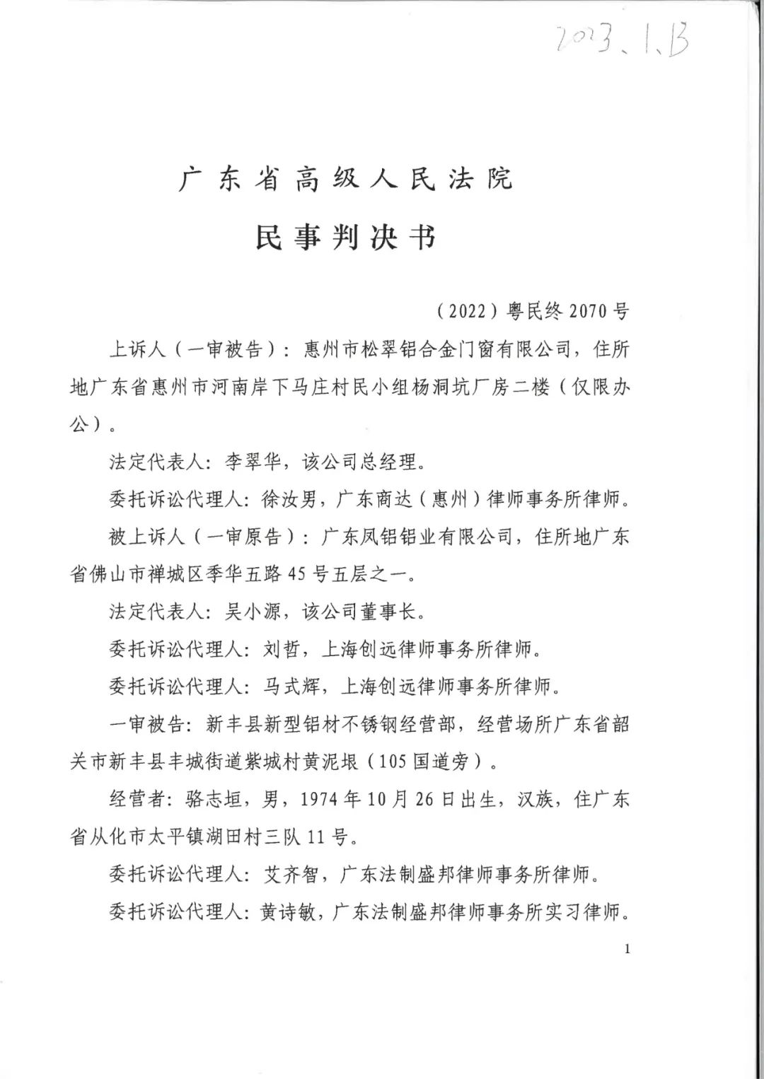张掖辉知胜诉佳讯 | 侵害“凤铝”商标案广东高院二审维持原判,判决赔偿255万元